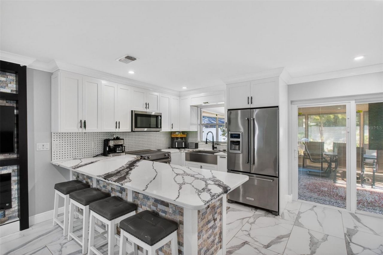 Welcome to this beautifully updated home in the highly sought-after Pinebrook Estates, where comfort, convenience, and worry-free living come together. Step inside and immediately feel the difference. The open layout and durable tile flooring throughout the home create a clean, modern look that is easy to maintain and ideal for Florida living. The spacious kitchen, complete with quartz countertops, stainless steel appliances, and generous cabinetry, is perfect for anyone who enjoys cooking, entertaining, or simply spending time with friends and family. A built-in electric fireplace adds a warm and inviting focal point to the living area. It offers a hassle-free fire display without the mess and provides real heat when you want it, giving you comfort with the touch of a button. The split floor plan provides privacy and flexibility, featuring a relaxing primary suite with built-in cabinets and an updated en-suite bathroom. The additional bedrooms also include built-in closets, offering plenty of storage for guests, family, or a home office. Custom cabinetry in the hallway adds extra organization, while the large screened lanai, measuring 15 by 22 feet, gives you plenty of space to unwind outdoors, garden, or host weekend cookouts. The fenced backyard adds even more room to enjoy the Florida lifestyle. The two-car garage provides secure parking, additional storage, and the extra convenience every homeowner appreciates. This home offers true peace of mind with a newer roof, and electrical panel. Pinebrook Estates continues to be one of the most desirable spots in the area thanks to its central location and high-and-dry elevation, offering quick access to major highways, shopping, dining, and the beaches without the flooding concerns found in other communities. A short walk brings you to Pinebrook Park, featuring remodeled racquetball courts, a large playground, tennis courts, picnic areas, facilities, and a dog park. Homes in Pinebrook Estates move quickly for a reason. Schedule your private tour today and experience everything this home offers. Do not wait.